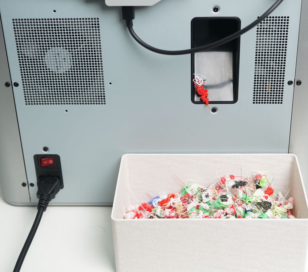 除了這些照顧線材餵養的部件,整個系統是密閉的,並有一個濕度感測器。加裝矽膠O型圈,確保濕氣不能進入,進而破壞吸濕性的線材,如PA、PC等等。在列印機本體上,用於清洗材料的垃圾滑道坡,減少列印清洗塔所用的時間,以及工具頭上的線材切割器,切斷不需要的線材。