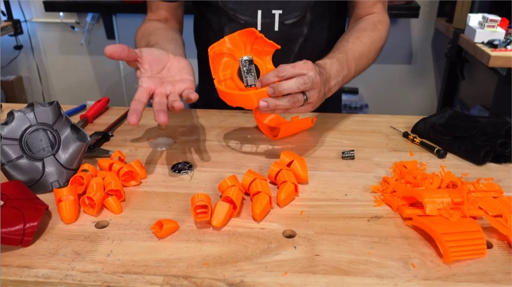 他提到最早的鎧甲模型通常是由一整隻手組成的,需要自己切割或分成兩半。 後來(lái)出現(xiàn)了 Walsh3D 的模型,它提供多種組裝方式,幾乎可以任意組合,而且你可以輕鬆地根據(jù)自己的需求進(jìn)行調(diào)整。 Kersey 選擇的是鉸鍊式鋼鐵人手,因?yàn)樗嘴杜宕?-你可以用磁鐵或插銷(xiāo)固定它,而且它還為電子設(shè)備提供了一定的空間。