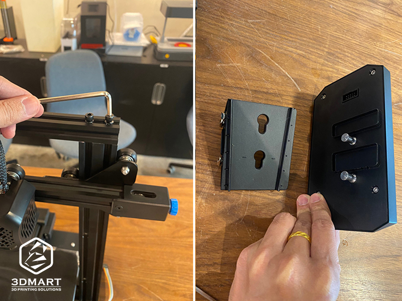 將顯示螢幕底座上推分開,再用內六角板手安裝底座在機器左側,最後再將其鎖緊,再將螢幕扣回底座即可。