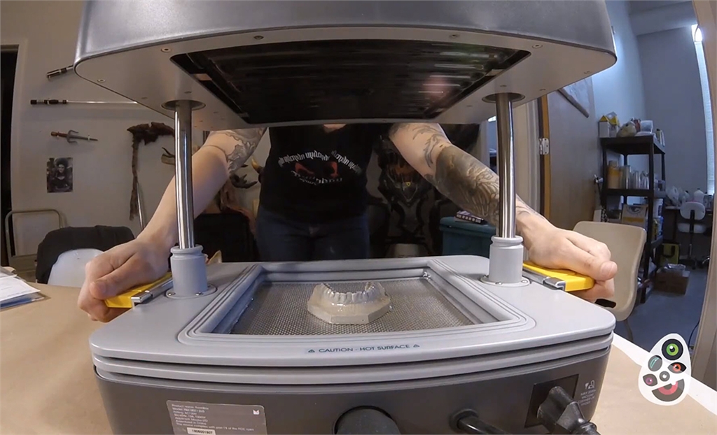 為了讓模型底部更平整以便後續(xù)加工,可在牙齒模型底部再注入石膏;接著將牙齒模型放入FormBox真空成型機(jī)、搭配透明注塑材料片進(jìn)行吸塑,下壓只需3秒!脫模後依照牙齒造型切割材料片,道具牙齒的基底即可成型。