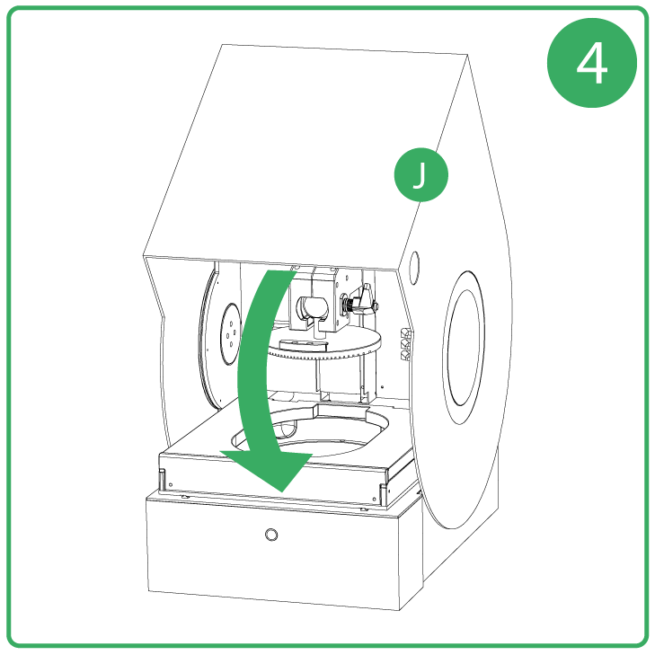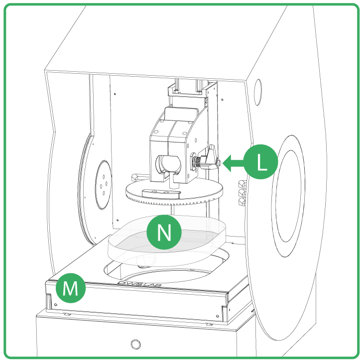 九、列印準備 ①3D列印機啟動 1. 打開列印機,啟動Fictor並按開門鍵(“Open”)。 2. 提起列印機遮罩(J)。 3. 將固定樹脂匣(M1)上蓋的樹脂盒卡扣(M2)往使用者的方向拉起。 4. 將樹脂槽放入列印機內(N),確保凹槽與樹脂匣(M3)的外殼吻合。 5. 搖晃樹脂並取下樹脂頂部的綠色蓋子(R)(不要取下保護膜)。 6. 將噴嘴(S)按壓到位,直到完全插入,然後如圖所示旋轉噴嘴。 7. 按照標籤上的說明(要列印在樹脂標籤上的指示後要檢查的項目6和7)將樹脂插入樹脂匣(M3)中。 8. 按下樹脂匣上蓋(M1)將其關閉。檢查樹脂盒卡扣(M2)確認上蓋已被鎖定。 ②平臺定位(移除階段) 1. 檢查平臺是否乾淨,並使用專門提供的梳子和用酒精(乙醇)沾濕的無絨布清除乾燥的樹脂殘留物。 2. 將平臺旋鈕(K1)插入相應的孔洞(T),使U處於水平位置,然後按直到完全插入。 3. 向用戶方向拉動鎖定桿(L),使平臺移動旋轉到水平位置上(K)。 注意:在這個階段不要鎖定平臺。 4. 放下列印機遮罩(J)。