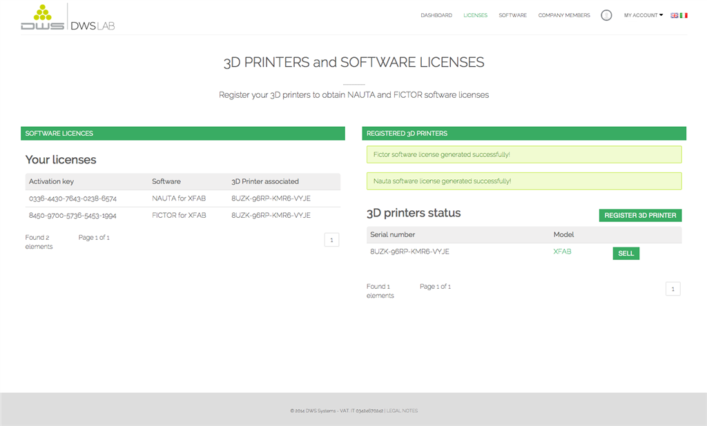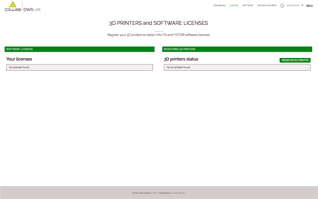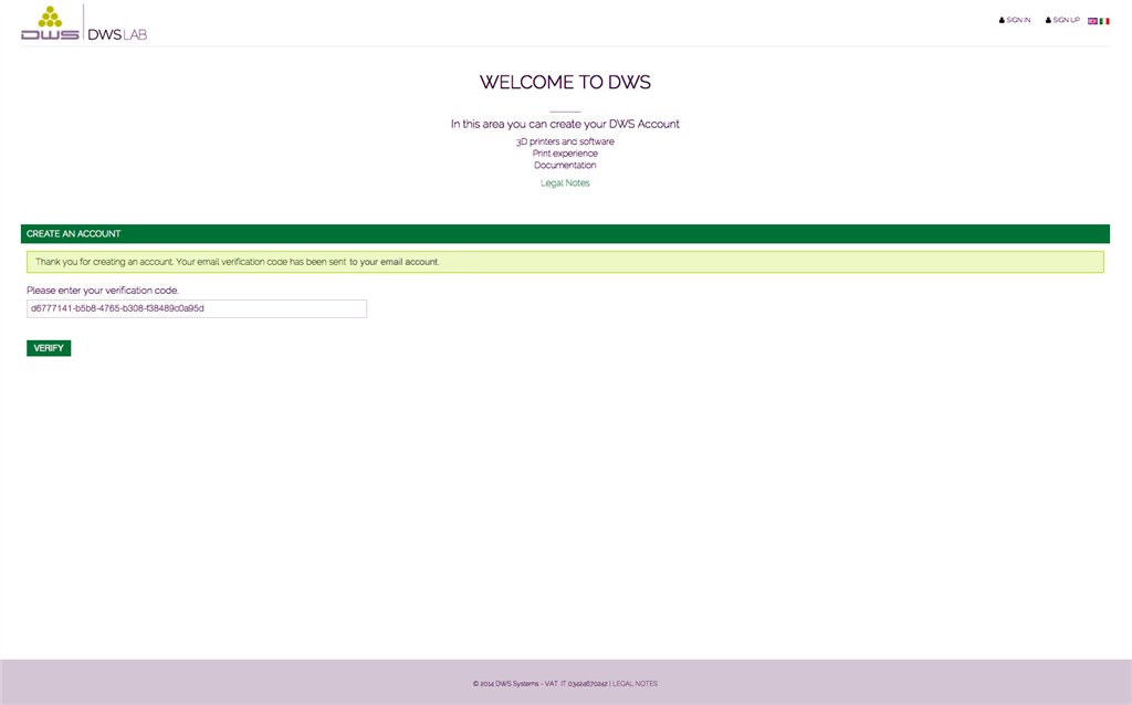 三、用戶註冊 1.前往customers.dwssystems.com頁面 2.點擊“Sign in”前往註冊頁面。 3.輸入所需的訊息,然後按照說明完成註冊。 4.打開註冊驗證郵件,然後點擊驗證連結。 5.點擊“Vertify”以完成註冊。 6.點擊“Sign in”。 7.輸入用戶名和密碼,然後點擊“Login”。 8.點擊“Register 3D printer”以註冊您的3D列印機。 9.在相對應的框框中輸入序列號(位於列印機背面的名牌上)和列印機型號,然後點擊“Save”。 10.如果打開列印機,則可以通過點擊“Save”將列印機與註冊用戶斷開。