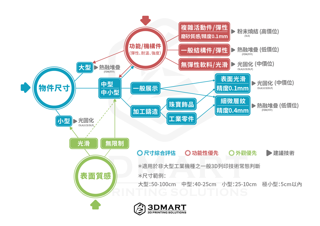 只要先了解最終成品的用途,確認哪些是優先條件後,由相應的箭頭處開始選擇即可,包括需要後加工的金屬鑄造件都可以這樣篩選,考慮的方向例如:外觀光滑、重複組裝、戶外使用、限定尺寸…等。