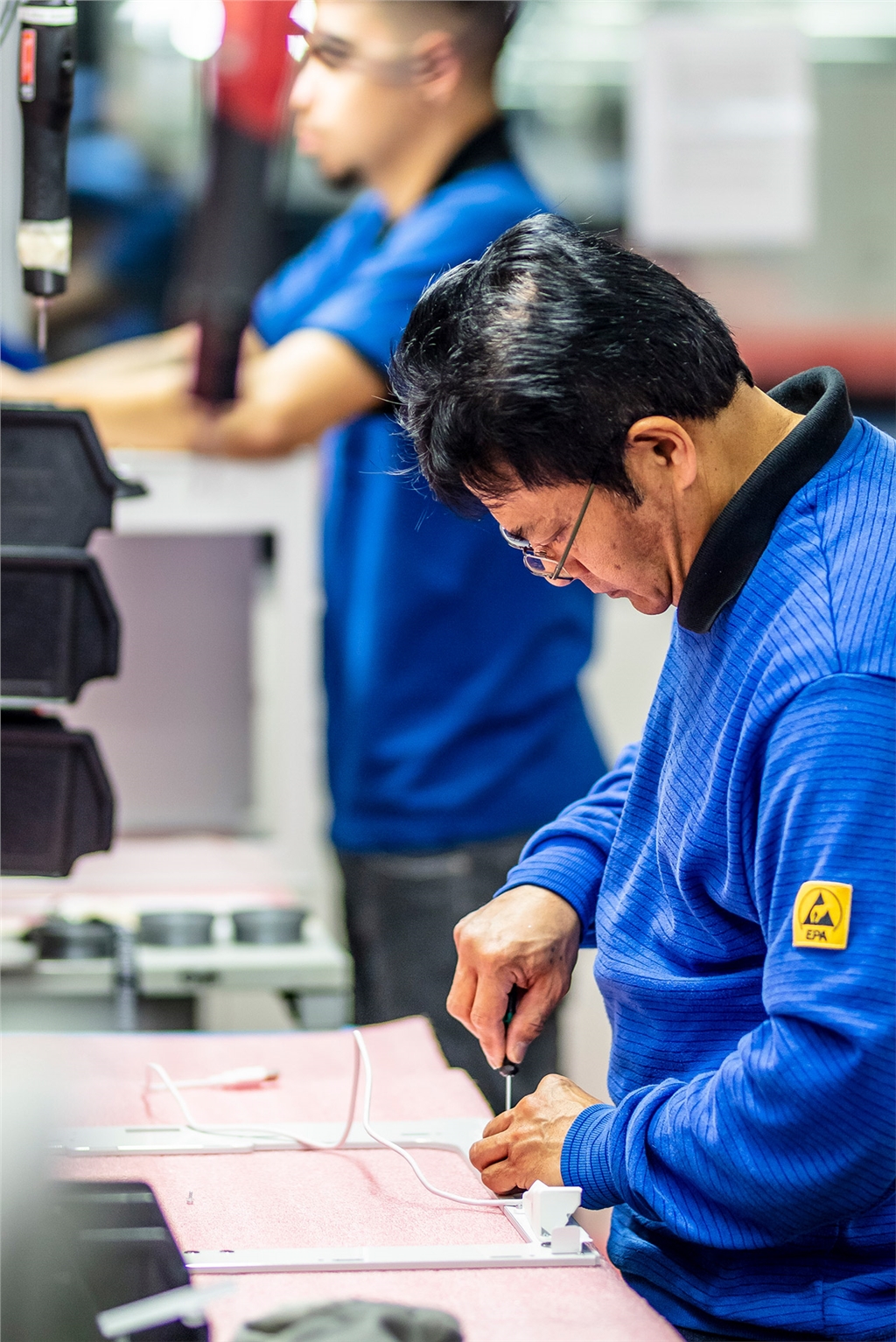 (面板和零件從滾筒輸送帶運送至生產區、準備裝配。)