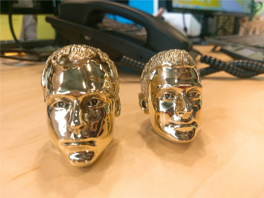 【3D列印快訊】輔助鑄造新材料-PolyCast 之前我們的文章也介紹過用SLA光固化列印機來列印鑄造用物件,再送至工廠進行脫蠟鑄造。 現在我們多了一個新法寶PolyCast列印線材,PolyCast是專門為金屬熔模鑄造(脫蠟鑄造)設計的材質,能夠搭配酒精拋光機完成拋光,並且在鑄造時可以完全燒熔來確保模腔的完整性。 介紹了那麼多,等不及想瞧瞧我們印了什麼吧? 什麼?! 居然是人頭,而且還十分就地取材的用公司同仁的頭像,製作方式為先用掃描機掃描頭像後產生的3D檔,接著進行3D列印人頭模型。 接著將列印出來的頭像放進Polysher 酒精拋光機中,準備開始來個酗酒之旅(誤) 看起來十分放鬆的旋轉頭像中,微醺的狀態,等候幾分鐘的時間 微醺的頭像拋光完成,瞧他宛如新生的模樣,光滑細緻的表面 若這機器能用在真人臉上,醫美診所應該都會失業吧,實在是太神奇了! 最後完成的黃銅頭像成品 來看看其他鑄造的成品吧! 最後成形的黃銅頭像,可以看出都有十分光滑的表面 三顆金頭排排站 放顆老闆的頭當擺飾小物好像也不錯(? 現在只需使用此PolyCast列印線材就可以幫助你快速生產小批的金屬零件,免除投資鉅額才能製造的模具,3D列印的方式幫助你節省了10倍以上的金錢與時間 。 下次或許可以考慮將喜歡的人(or偶像)製作成頭像模型,然後放在家望著他癡癡地發呆?! 酒精拋光機 Polysher http://88778853.com/en/shop/polysher