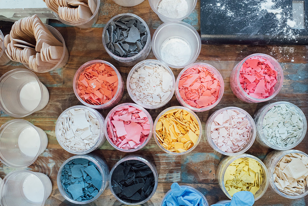 接下來將凝固後的水磨石碎塊,依照自己的喜好調(diào)配用量、顏色,倒入Jesmonite樹脂中均勻攪拌;最後再將所有材料倒入真空成型的模具中,完全凝固後再經(jīng)過打磨加工,高品質(zhì)的自製杯墊就完成了!你也能舉一反無限,設(shè)計屬於你的各種容器、托盤、盆栽等居家裝飾品。