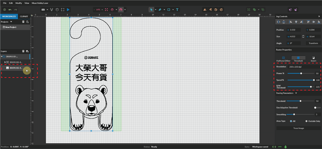 .雷射功率:數值愈高雷射愈強,本次用於壓克力圖片雕刻,我們選擇50%。