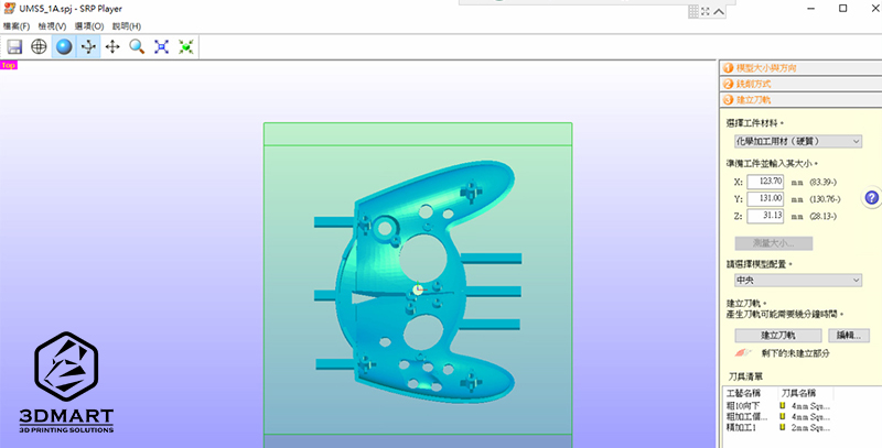 我們採用之前3D列印過的遊戲把手做樣品測試,Roland作為CNC設備的大廠也提供專用的運算軟體,以便調整各項參數值;圖中淺綠色的部分是原料的體積範圍,必須大於中央物件的成型範圍。