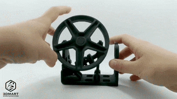 這次的Sinterit樣品是汽車懸架的一部分,為了在一次性3D列印中展示各項連動功能,因此特別設計出綜合結構,例如可以轉動的圓盤就是汽車輪圈的位置: