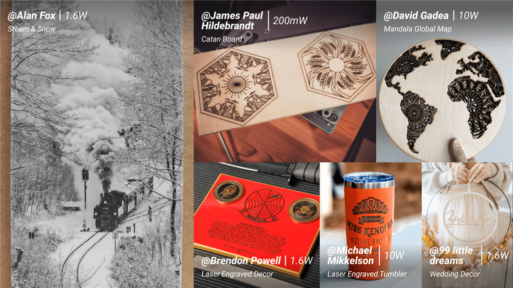Snapmaker的用戶喜愛雷射的每一次升級,並毫不猶豫地與其他人分享他們的創作和經驗。以下是社群中數千名用戶案例中的一些示例。其中大多數是家居裝飾、送給愛人的禮物和手工藝品。有些甚至以此為生。