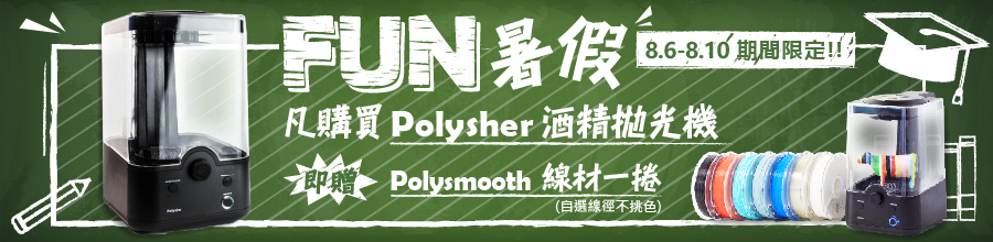 【好康速報】暑期限定最優惠!8/6-8/10買拋光機送線材! 3DMart 陪你歡樂FUN暑假!凡於8/6到8/10期間限定,購買Polysher 酒精拋光機即贈PolySmooth線材一捲(顏色隨機、可選線徑)! 原價1580元,買到賺到、做夢會笑;沒有學生證、沒有暑假也沒關係,趕緊看準日期下單,同樣享優惠! PolySmooth是一款可被酒精拋光的新材料,列印條件幾乎和PLA一模一樣,容易列印、極低翹曲率、良好的強度及支撐易拆除,而且搭配Polysher酒精蒸氣拋光機,能讓你創造光滑的表面質感;輕鬆後加工、完工及成品!別說小編沒提醒你,拋光機輕鬆讓你的成品高貴不貴,時間一到速速開搶!!! 貼心附上懶人連結:http://88778853.com/en/products/polymaker-polysher