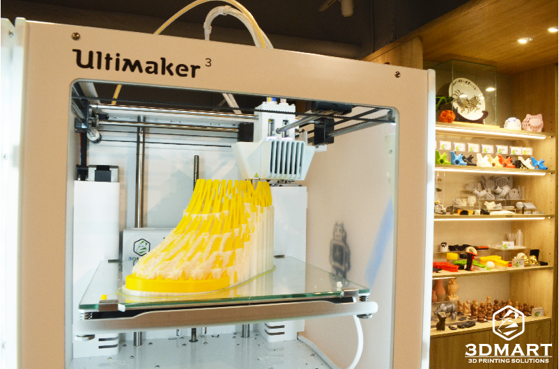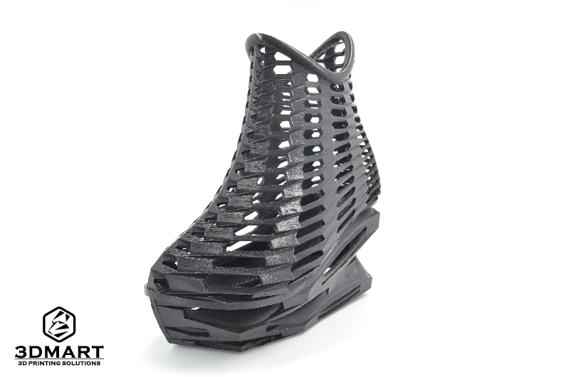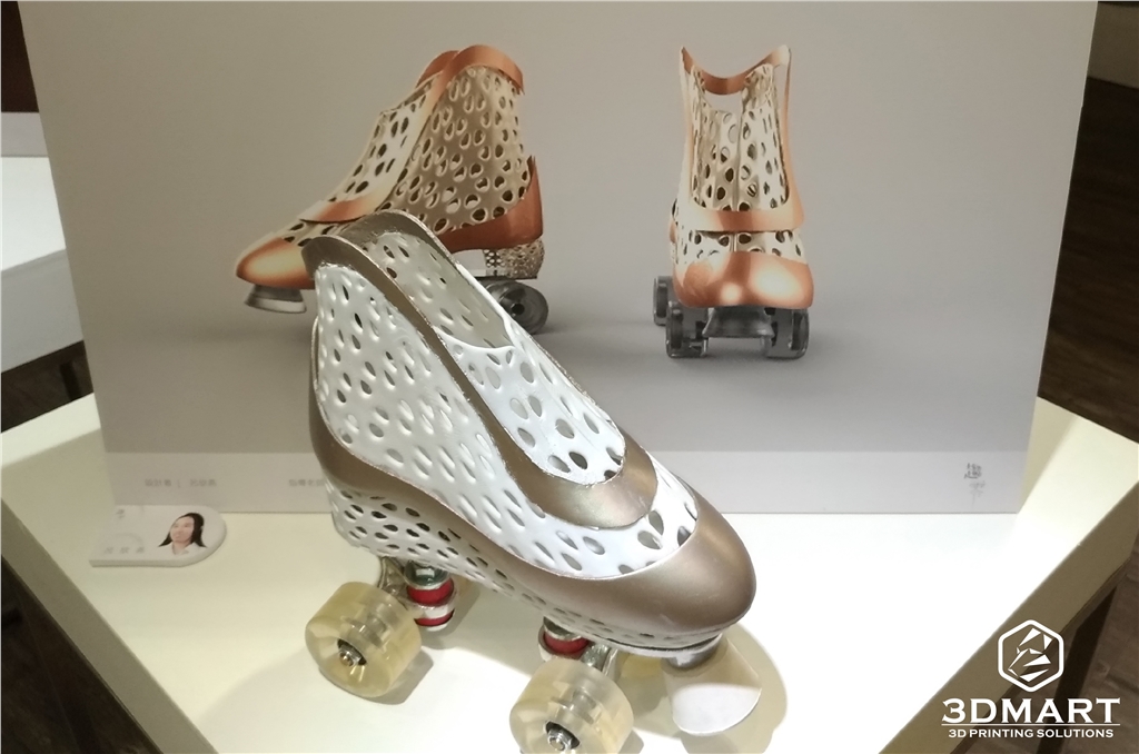 【3D列印應用】新潮設計3D列印鞋款 3D列印的應用方式非常多,像是公司開發商品原型時會利用3d列印技術,有些學校也會使用3d列印機來輔助生產 教材或完成學生的設計想法。 這次3DMart收到來自大學的工業設計系學生的3d列印代工委託,幫助完成他們的設計構想,他們剛好都是設計鞋 款,各具不同的特色,我們將於此篇文章向大家介紹他們的設計歷程。 第一個的黃色設計款女用鞋是李同學的作品,主要是為了畢業專題所製作的作業,設計的靈感結合樹根、骨骼密度 的造型以及網狀的血管,是一款十分優雅的新穎設計女士鞋款,鎖定25-35歲具時尚感的輕熟女族群 李同學表示會使用3d列印技術完成此鞋款,是因為此鞋子模型在造型上很複雜並且要求高細緻度,在製程上面選擇 3d列印機印製也比較簡單,並且在最終完成度也很高。 由於設計上有許多鏤空的部分,必須使用Ultimaker3雙噴嘴3d列印機,讓PLA搭配水溶性支撐材PVA,不須擔心有 拆不完的支撐以及支撐拆除後的粗糙表面。 在Cura的設定上我們盡可能地將PVA的用量調至最低,避免材料的浪費並節省泡水的時間,總共的列印時間約為2天。 圖為正在3D列印的黃色女用鞋 (列印層厚:0.15mm 填充率:30%) 這次決定設計鞋子作為畢業製作是來自老師的提議,由於聯合大學工設系所在工專時期是以鞋子設計為主要項目, 後來才轉變為以產品設計為主,此次有種想重拾初衷再次挑戰過去鞋子設計的強項。