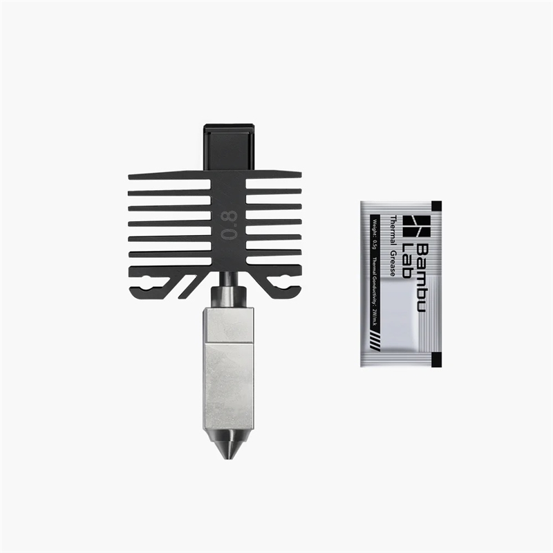 帶不鏽鋼噴嘴的熱端組件採用的一體成形設計。僅適用於Bambu Lab 3D列印機。噴嘴集成到模組中,並透過細金屬連接到散熱器,已獲得最佳性能。有了這種設計,模組的加熱速度會比普通的模組快得多,而且一體成形設計有效地減少更換噴嘴可能的問題。散熱片採用高導熱鋁合金,喉部採用TC4鈦合金。噴嘴由銅合金和不鏽鋼組合製成,在保證硬度的同時可大流量列印。