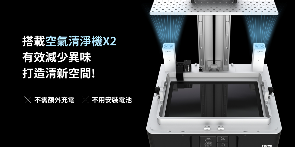 全新配備兩個可拆式空氣清淨機,不需額外充電也不用安裝電池,插上機臺即可使用,有效消除列印時產生的異味,雙倍舒適、雙倍清新!