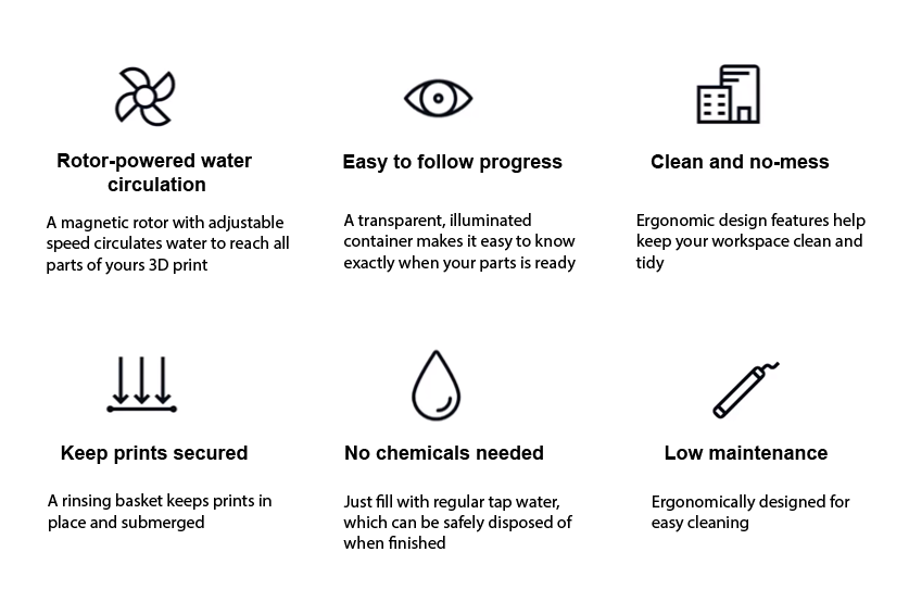 The Ultimaker PVA Removal Statione is driven by a magnetic rotor, enabling a high-speed dissolution process. It can remove PVA four times faster than removing PVA in a temporary container using motionless water, even from hard-to-reach cavities.
