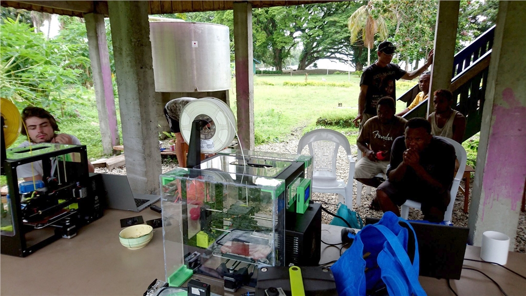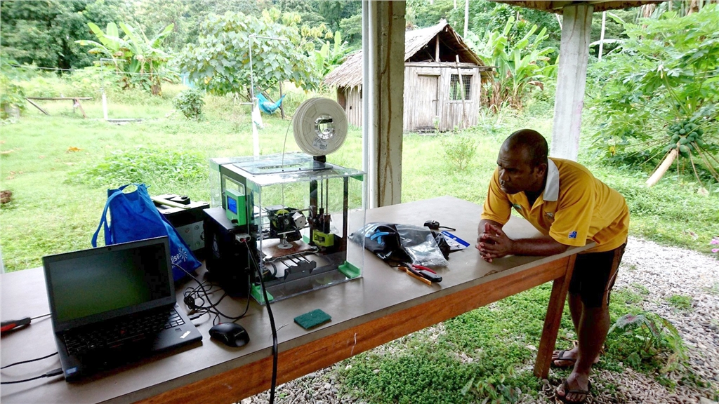 當一股颶風在所羅門群島肆虐時,一名男子抱著3D列印機在胸前,以防止它在猛烈的風中被吹走;這部3D列印機繼續為重要的基礎建設列印零件,同時他的同事們則安裝太陽能板為它供電。