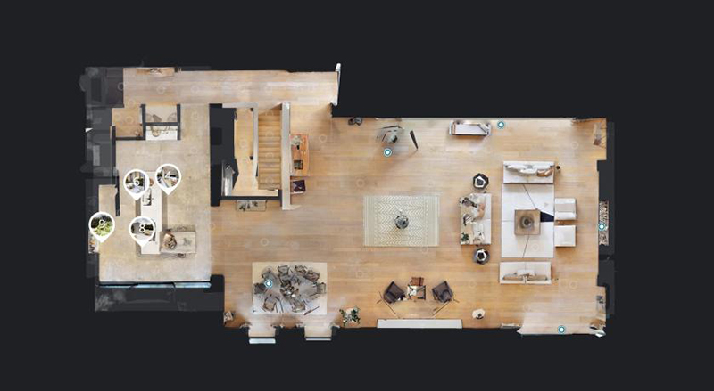 Matterport內部近景模式,就像玩RPG遊戲一樣,只要點選地上的圓點,就能在3D虛擬空間中自由移動,無論在哪裡都像身歷其境一樣;滑鼠只要點選Mattertags標籤,就能看到想買的商品詳細的材質、版型、尺寸。
