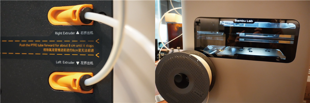 機(jī)臺後方貼心了標(biāo)示兩具擠出機(jī)的線材路徑,避免使用者誤用。
