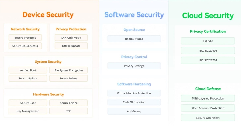 這個公共中心詳細介紹了 Bambu Lab 安全架構的全方位深度——從硬體級加密到第三方資料儲存——儘管並非所有措施都已在每臺印表機上啟用。