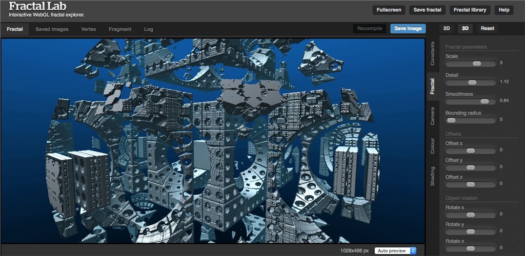 FractalLab是奠基於WebGL程式碼的分形3D建模,和一般的3D列印物件相比,更偏向有機(jī)體的變化和製作抽象場(chǎng)景?;靖拍钍鞘褂貌煌臄?shù)據(jù)控制來(lái)產(chǎn)生不同的成像效果,例如:調(diào)整比例、細(xì)節(jié)或平滑度,可以產(chǎn)生具有萬(wàn)花筒一般的對(duì)稱(chēng)變化。不過(guò)如果要從頭開(kāi)始建立新的分形體對(duì)初學(xué)者來(lái)說(shuō)比較困難,必須具備程式碼的相關(guān)知識(shí);但這款免費(fèi)3D軟體中的分形庫(kù)中也提供多種元素,對(duì)於需要抽象3D場(chǎng)景或圖面的需求者來(lái)說(shuō)仍是很棒的元素。