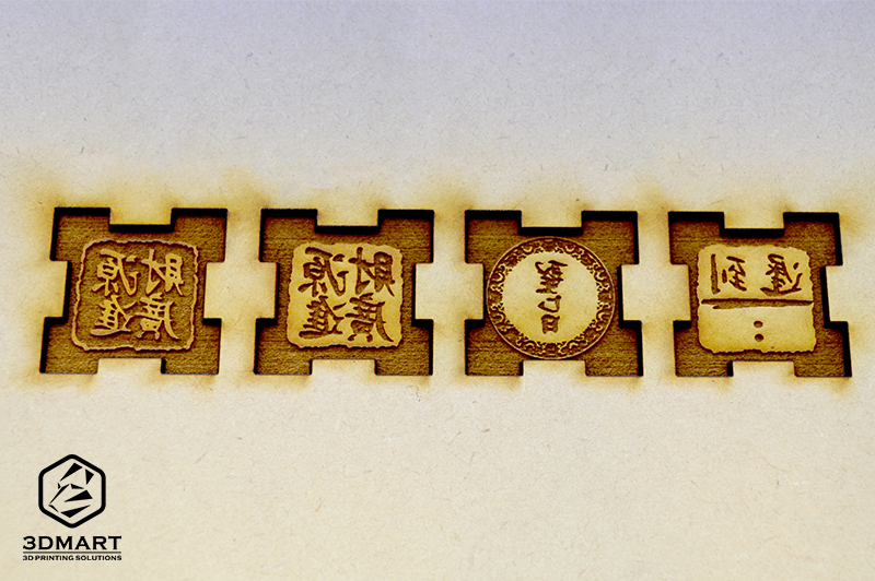 FLUX beambox在小尺寸2cm的印章上,雕刻出高解析度的效果、清楚呈現筆畫寬度只有1mm的毛筆字體,雷射切割拼圖結構只需要1分鐘、雕刻印章也只花5分鐘就完工。