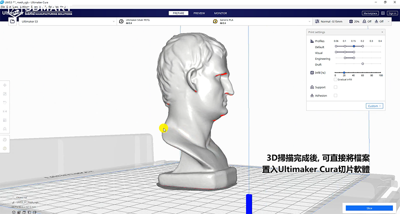 過程中可以依照需求,調(diào)整物件的擺放角度,依照上方步驟重複進(jìn)行掃描,捕捉更全面細(xì)節(jié),完成後點(diǎn)選結(jié)構(gòu)參數(shù),勾選「進(jìn)行補(bǔ)洞」軟體將自動(dòng)針對(duì)模型進(jìn)行補(bǔ)洞(3D掃描總時(shí)間:5分鐘);點(diǎn)選彩色預(yù)覽,可以即時(shí)切換物件原色,3D掃描完成後,可直接將檔案置入Ultimaker Cura切片軟體,即可直接進(jìn)行3D列印。(或是依照需求執(zhí)行其它後處理)