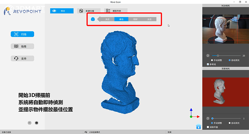 使用腳架固定掃描器,搭配轉(zhuǎn)盤進(jìn)行3D掃描,開始掃描之前系統(tǒng)將自動(dòng)即時(shí)偵測,並且會(huì)提示物件擺放的最佳位置。