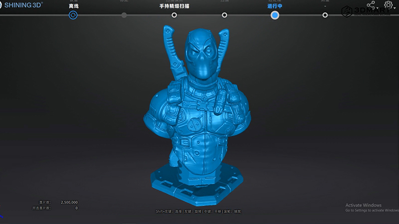 接著我們使出細節度高、結構複雜的3D列印死侍(20 x 18.5 x 15cm),來挑戰Einscan Pro HD的掃描效果,使用手持高清模式,環繞掃描模型的每個面向,可以依照模型大小自由移動,掃描範圍廣泛不受限;3D掃描物是黑色布料、透明玻璃、金屬反光等會影響光照結果的材質,別擔心!只要在表面噴上掃描噴粉顯像劑,就可以順利進行掃描!(點我看:自動消失的掃描噴粉?)