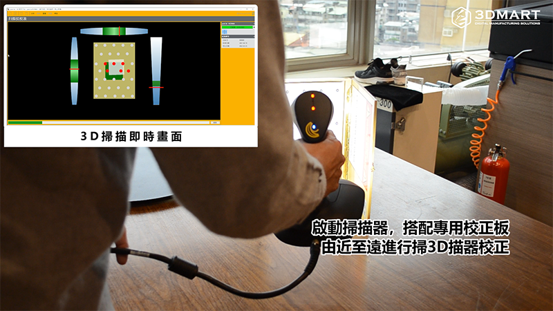 依照SHINING 3D掃描軟體的步驟,對準校正板進行校正,啟動掃描器開關,由下往上緩慢移動,直到所有綠色色塊都打勾;使用專用支架將校正板墊高,依照軟體中指示,接續進行校正。