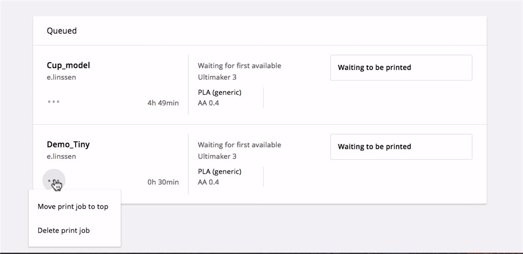 6. 選單中可選擇「Move print job to top」與「Delete print job」,可依照需求調整3D列印作業的順序。