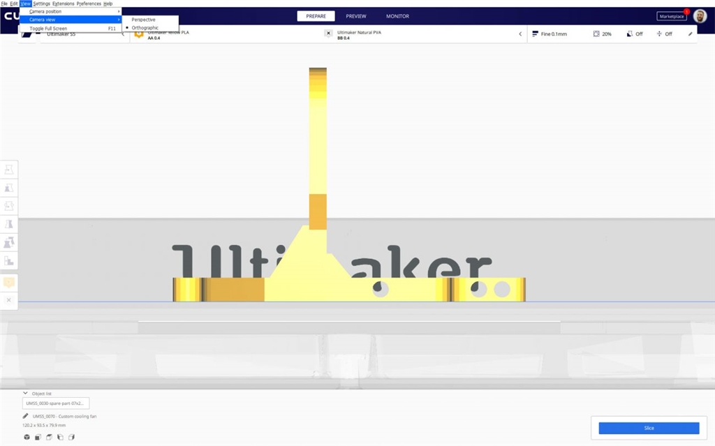 作為專業用戶,在準備列印時需要對3D視圖類型進行更多控制,Cura 4.2引入了正視圖功能 - 與專業CAD軟體使用的視圖類型相同,因此您可以輕鬆地將模型的尺寸與CAD設計進行比較。 在「檢視>相機檢視>正視圖」中找到這個選項(實際名稱與位置將以Cura 4.2正式版為主)。