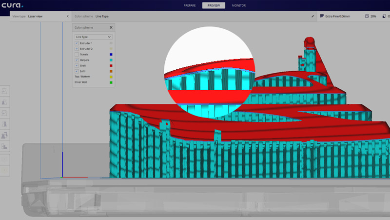 預覽視圖中的填充和支撐界面現在有新的配色選擇,可以更容易在複雜的模型中區分它們。填充線現在顯示為橘色,支撐界面則以藍色做出區別;這項功能在上方的「顏色方案」>「線條類型」中可以找到。