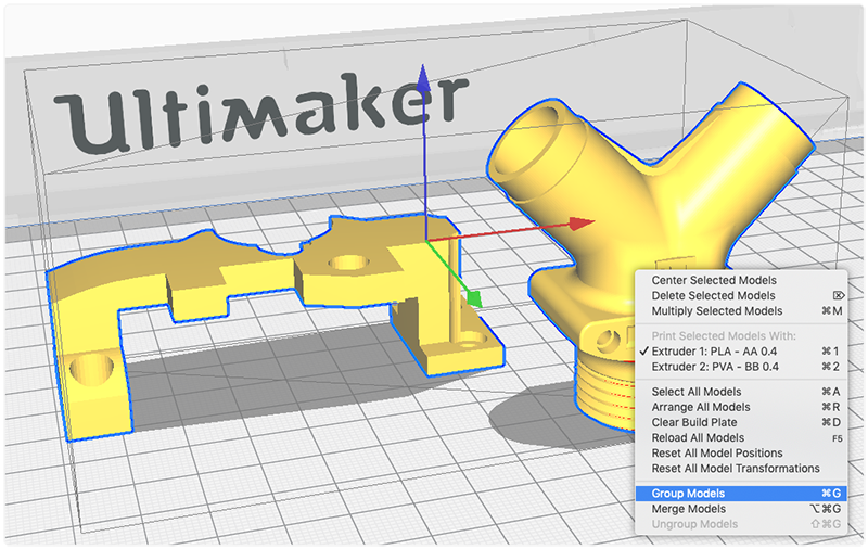 1.在列印平臺上選擇兩個或多個模型,使用「Shift」 +左鍵點擊每個模型。