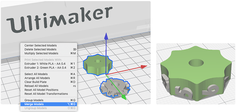 使用雙重材質/顏色模型時,合併功能非常有用,讓模型以最簡單的方式組合。
