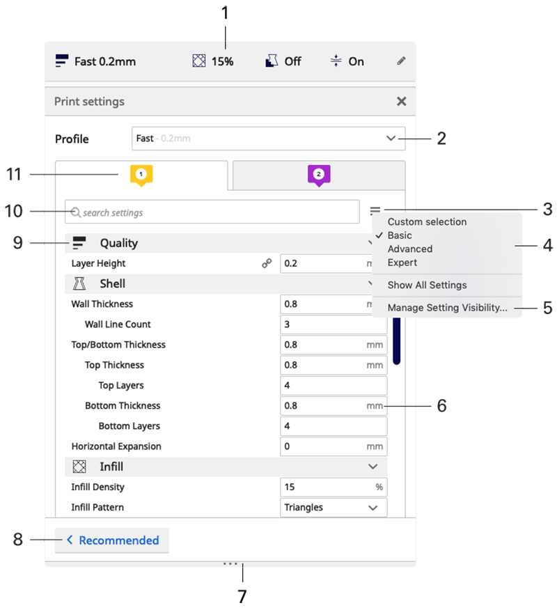 Ultimaker Cura的設定面板中有推薦與自訂模式,推薦模式適用於初學者,而自訂模式能為有經驗的用戶提供更多的設定。