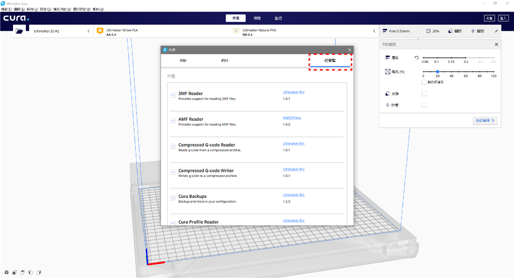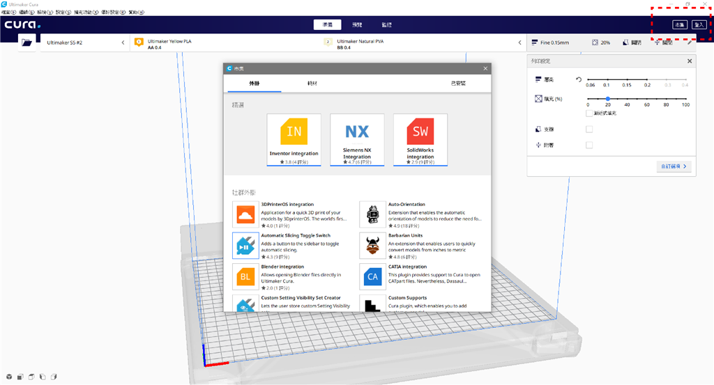 (在「市集」的「耗材」選單中可以看到各式新增的材料聯盟廠商及其提供的線材資料,並可以免費在此下載Ultimaker專用的官方列印參數)