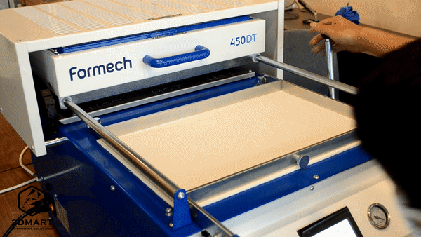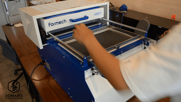 一切準備就緒後,將手柄往前下壓,工作平臺就會往上移動貼近材料片,這時候只要按下吸塑按鍵就能快速、不費力的完成