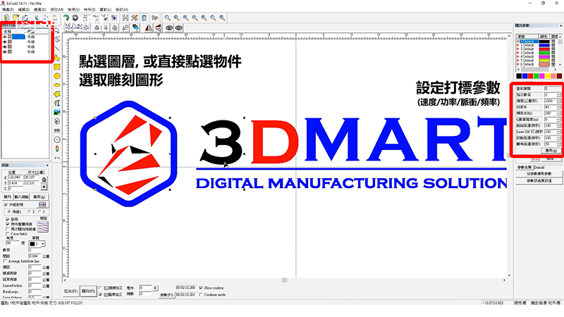 依照打標物件材質,點選圖層或直接點選物件,選取雕刻圖形,進行參數設定(速度/功率/脈衝/頻率)。(注意:下圖中物件顏色僅為「圖層顏色」)