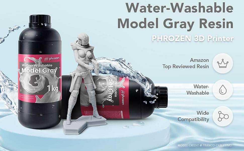.可水洗樹脂 Phrozen水洗樹脂與一般油膩樹脂不同,親水性佳可直接用清水洗淨表面,簡單易用。(清洗的水請接起來照光並過濾後再傾倒,或摻入10%廢水處理劑並將沈殿物過濾後再傾倒) .黏度適中、低氣味 Phrozen水洗樹脂黏度低、好操作易清洗,列印時不會有惱人氣味影響環境。 .反應快速 Phrozen水洗樹脂針對405nm波長LCD機臺調控樹脂配方,Shuffle系列一層7秒、Sonic系列一層1.5秒(50µm),列印飛快。 .韌性好不易碎 不同於一般水洗樹脂易碎裂的特性,Phrozen水洗樹脂硬度高帶點韌性,適合列印模型公仔,也適合產品打樣。 極速黑-3D列印成品實例 : 模型灰-3D列印成品實例 :