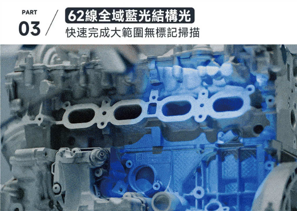 碰到完整車身、客制面板、輪胎框架、車輛汽缸 等複雜大面積時,62線全領域藍光結構光以 7,000,000點/秒的速度 即時生成掃描點,大範圍覆蓋掃描物品;用最短的時間達到最大的效益,就連不突出的物品狀況也能快狠準捕捉。
