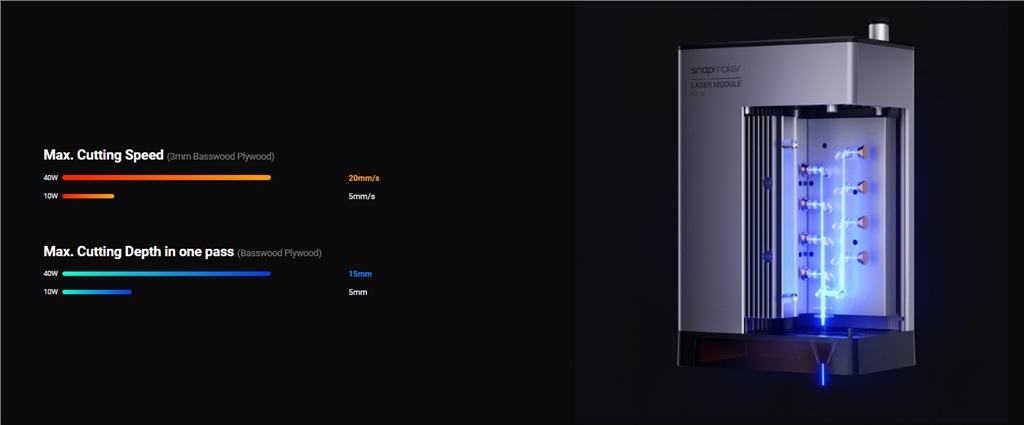 40W 雷射模組採用最先進的雷射分束器和光束整形光學元件,性能卓越。在切割 3 毫米椴木合板時,40W 雷射模組的速度是 10W 的 4 倍!