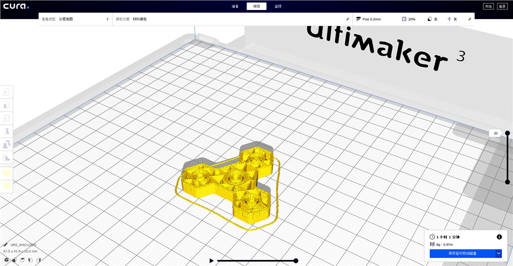 指尖陀螺材質(zhì)為PLA,使用Ultimaker 3D列印機(jī)一體成形列印完成、完全無須組裝、不額外使用培林(市售旋轉(zhuǎn)軸心),共有四個(gè)輪軸、皆可轉(zhuǎn)動;從最新版的Cura 4.0切片軟體當(dāng)中可以看到內(nèi)部結(jié)構(gòu),旋轉(zhuǎn)軸使用類似扯鈴的漸變造型,讓它在無需支撐材的情況下也能順暢轉(zhuǎn)動,不會掉落。