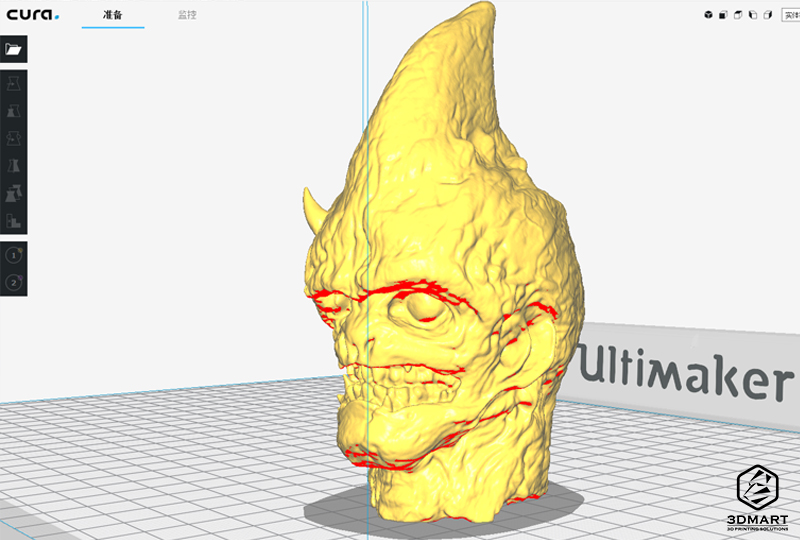 透過這種簡單的逆向工程,只要將3D掃描的檔案放到Cura 裡面就能用Ultimaker 3D列印機印出來囉!我們使用最新版本的Cura 3.6成像是這樣,紅色是懸空的部分,會自動形成支撐材料、無須另外建模,這些工具讓3D列印流程更加輕鬆容易。