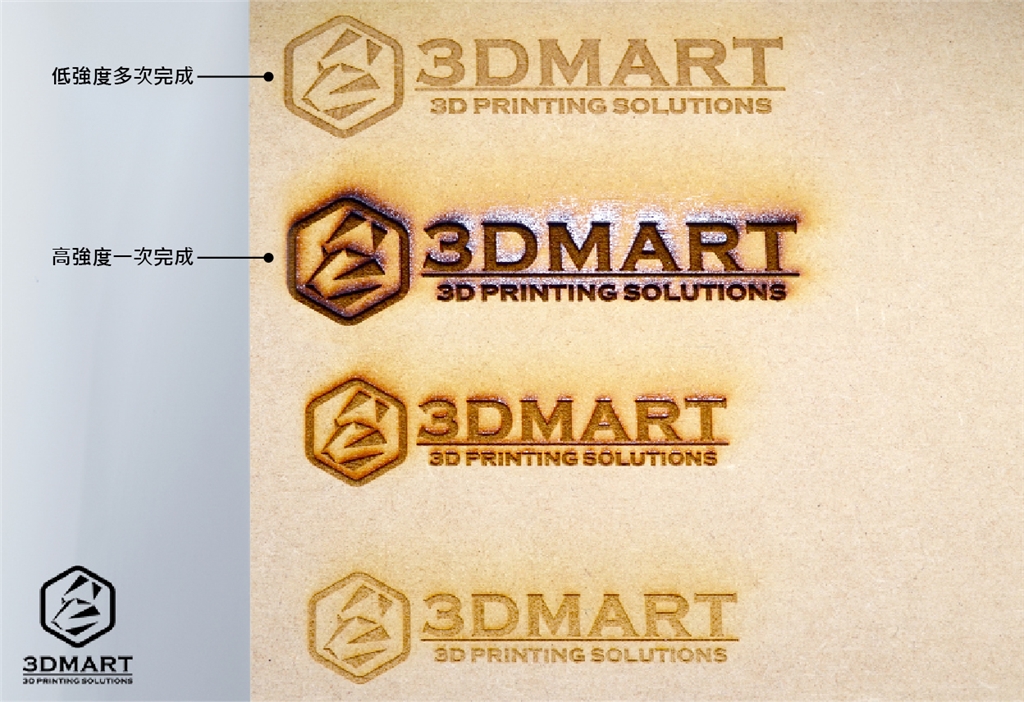 我們為各位測試不同功率打在木板上的效果,其中常見的焦痕問題可以透過功率速度調整來解決;由於木材本身帶有水分與油脂,受到高功率雷射加熱會有燒灼痕跡,相較之下使用低功率多次、快速完成可以得到更乾淨的效果。