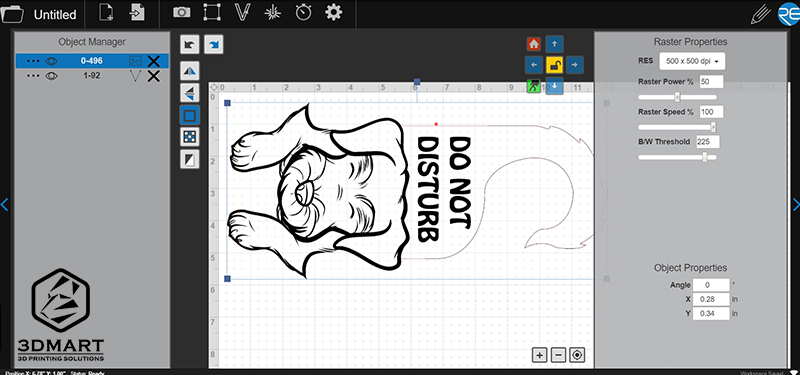 我們在網路上抓了一款免費素材(延伸閱讀:免費資源不藏私!5大3D模型庫都在這!)是可以掛在門外、表示「請勿打擾」的吊牌做測試,丟入RetinaEngrave v2軟體介面內可以自由縮放大小、預視切割範圍,右邊的欄位可以調整雷射加工的精細度或強度,整體為直覺式操作且方便易懂。