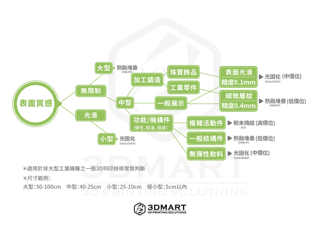 即使完全不了解3D列印技術的差別,只要知道大約有哪些選擇,並掌握自家物件的用途或外觀要求,就能大致判斷需要的方向,幫助快速選擇合適的應用類別。以市面最常見的3D列印技術來說,可分為熱融堆疊(FFF/FDM)、光固化(SLA/LCD/DLP)、粉末燒結(SLS):
