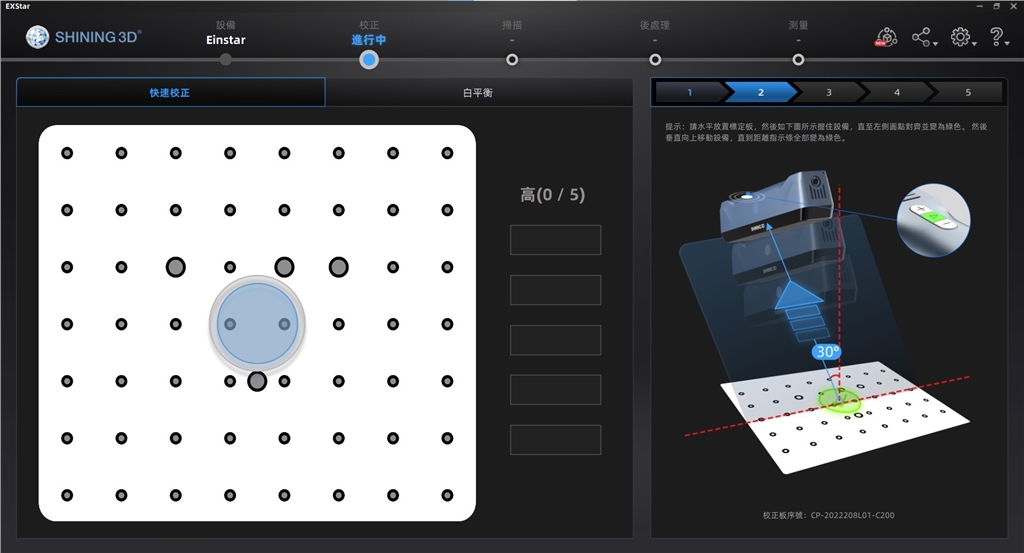 Shining 3D EinStar附有專用「校正板」,在開始3D掃描之前,只需依照軟體指示,對準掃描方框進行校正,即可輕鬆完成系統校正。分成兩個步驟,快速校正;總共需要從5個不同的角度(上、斜前、斜後、斜左、斜右)進行擷取。白平衡;緩慢平穩的上下移動掃描設備,在軟體提示中合適的高度時,掃描設備會自動擷取並完成白平衡校正。