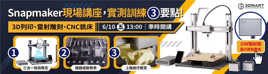 雷雕雷切你選誰?小孩子才選擇!看效果超心動嗎?Snapmaker 10W雷射頭免費送!三合一技術專業培訓,Snapmaker現場開箱講座,實測訓練3要點!3D列印、雷射雕刻、CNC銑床,三大工業技術好難學?不學你真不知道!技術基礎簡單,限量名額馬上搶: