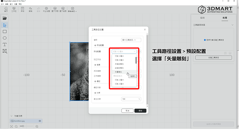 1. 「處理」>「創建工具路徑」/「預設配置」中選擇:矢量雕刻