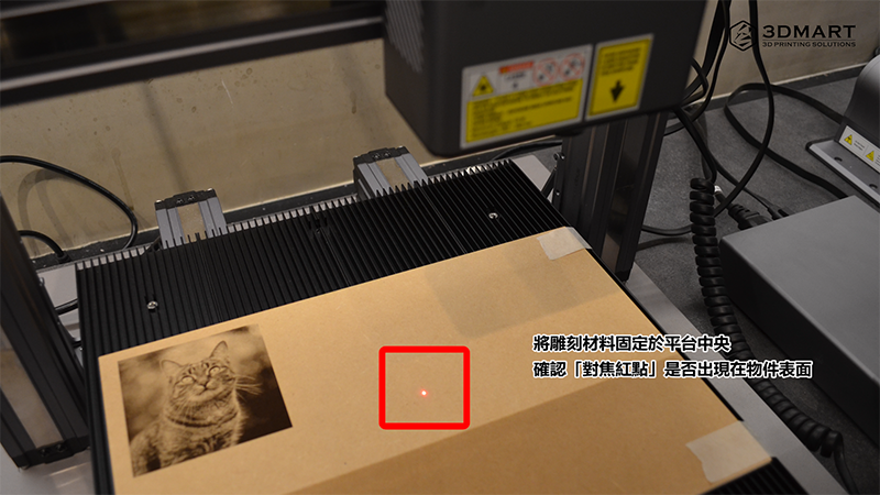 將雕刻材料固定於平臺中央,確認「對焦紅點」是否出現在物件表面,機器將自動偵測材料厚度,並將結果立即顯示在觸控螢幕上,確認材料厚度無誤,系統將自動完成對焦。開始雷射雕刻前,機器會以藍光預覽雕刻路徑,使用觸控螢幕上的箭頭,調整藍光位置直到符合需求的位置,設定3步驟: